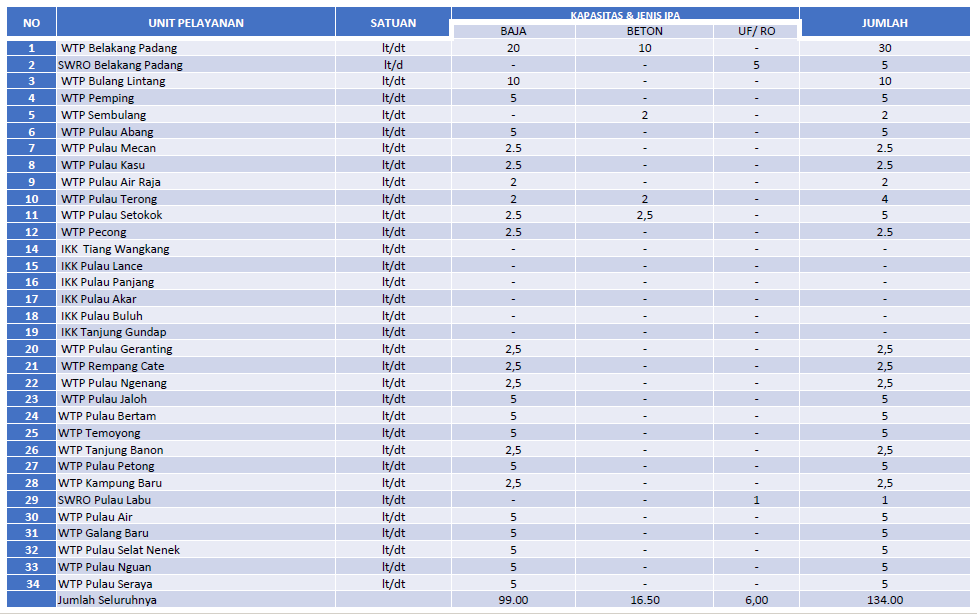 Dibidang produksi air bersih BLUD UPT PAB Kota Batam untuk kurun waktu sampai dengan tahun 2023 Kapasitas terpasang sebesar 7644 SR dan tahun anggaran 2022 mengoperasikan Instalasi Pengelolaan Air dengan total kapasitas terpasang sebesar 73 lt/ dt, masing - masing terdapat pada unit - unit pelayanan yang tersebar di wilayah hinterland.